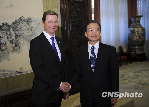 1月15日,中国国务院总理温家宝在北京中南海紫光阁会见了德国副总理兼外长韦斯特维勒。中新社发 廖攀 摄