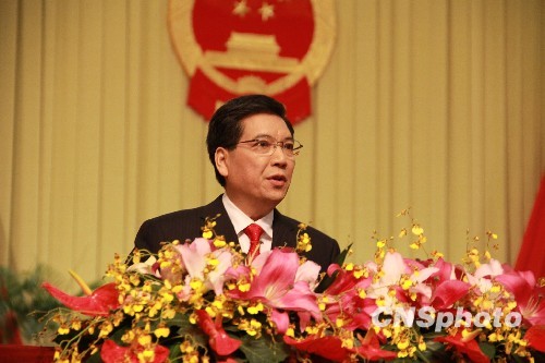 云南省第十一届人民代表大会第三次会议1月22日上午开幕,云南省省长秦光荣在会上做《政府工作报告》时表示,2010年云南的主要工作将围绕建设绿色经济强省、民族文化强省和中国面向西南开放的重要桥头堡三个方面展开,努力推动全省经济平稳较快发展和促进社会和谐稳定。中新社发 杨永刚 摄