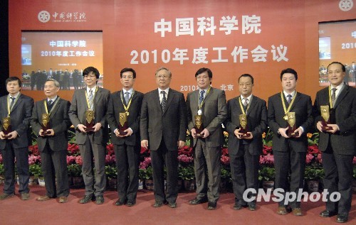 1月27日,中国科学院2009年中国科学院杰出科技成就奖在北京揭晓,上海微小卫星工程中心的“神舟七号”伴随卫星等研究集体获奖,全国人大常委会副委员长、中国科学院院长路甬祥为获奖个人和集体颁发奖章和奖杯。中新社发 徐曦弋 摄
