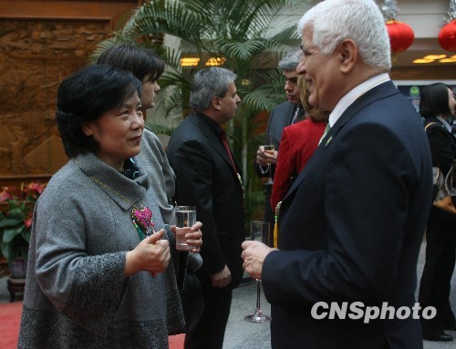 1月28日,中国外交部扶贫工作名誉大使乐爱妹在外交部扶贫工作答谢酒会上与伊拉克驻华大使伊斯梅尔交谈。多国驻华使节参加了当日的答谢酒会。中新社发 苏丹 摄