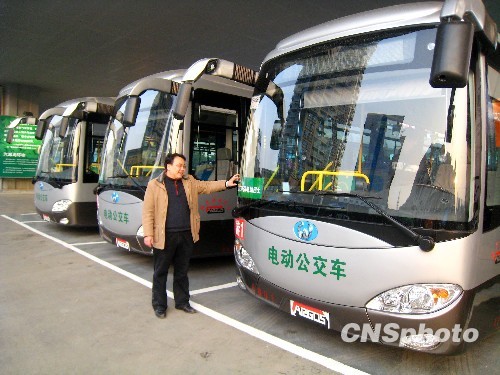 1月29日,江苏首批三辆电动公交车在南京迈皋桥刚建成的首座示范电动汽车充电站亮相。这三辆电动公交车将投入到游1路(从迈皋桥到中山陵)景点公交线营运。三辆电动公交车为公交企业降低“碳排放”带了个好头。图为停在电动汽车充电站的首批电动公交车。中新社发 谷昌旺 摄
