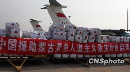 2月1日,由中国商务部组织的援助蒙古紧急人道主义救灾物资从石家庄机场启运,飞往乌兰巴托,该批救灾物资约180吨,包括1600包棉被、400箱发电机、450箱牛肉罐头、2500箱方便面、4300箱压缩食品等当地急需的物品,分两批次运送。图为石家庄国际机场180吨救灾物资。中新社发 翟羽佳 摄