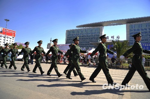 2010年2月1日,武警官兵在昆明火车站巡逻,严厉打击各种违法犯罪活动。1月30日,云南省正式启动2010年春运,春运将从1月30日至3月10日,为期40天。武警云南总队奉命担负昆明火车站执勤任务,他们组织人力投入到紧张繁重的春运值勤任务当中,确保春运安全。中新社发 郝亚鑫 摄