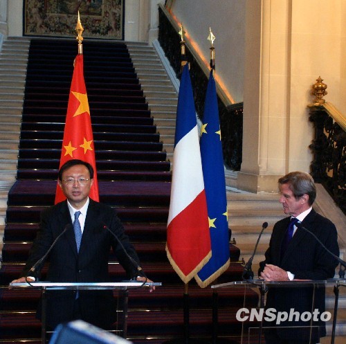 正在法国进行正式访问的中国外交部长杨洁篪3日在巴黎同法国外长库什内举行会谈,双方就进一步推动两国关系发展等达成重要共识。会谈后,杨洁篪(左)与库什内(右)举行了记者会。中新社发 吴卫中 摄