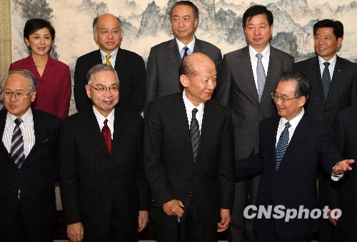 2月8日下午,中国总理温家宝在北京中南海紫光阁会见参加第五届中日友好21世纪委员会第一次会议的中日两国委员,并与日方首席委员、东京证劵交易所会长西室泰三(前排右二)等合影。中新社发 任晨鸣 摄