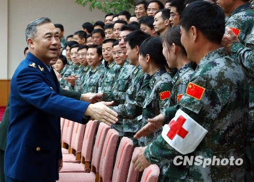 2月10日下午,解放军副总参谋长马晓天上将及总政、总后领导陪同中央军委委员、国务委员兼国防部长梁光烈上将,在北京八一大楼接见了圆满完成赴海地人道主义救援任务的中国医疗防疫救护队全体队员。解放军总政治部副主任贾廷安中将宣读了解放军四总部表彰医疗防疫救护队的通报。此次医疗防疫救护累计诊治近4000人,发放药品150余种,消毒杀虫面积达5.1万平方米、房屋帐篷2200余间(顶),现场卫生知识宣传教育2100余人,发放防疫防病知识宣传材料8000余册,检测报告传染病20余例,赢得了联合国驻海地地震稳定特派团及海地人民的广泛赞誉。中新社发 宋吉河 摄