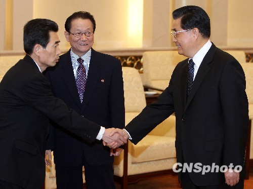 2月23日下午,中共中央总书记、国家主席胡锦涛在北京人民大会堂会见以朝鲜劳动党中央国际部长金永日(左二)为团长的代表团。中新社发 任晨鸣 摄