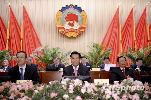 2月28日,全国政协十一届常委会第八次会议在北京闭幕。图为全国政协主席贾庆林、副主席王刚、杜青林出席会议。中新社发 廖攀 摄