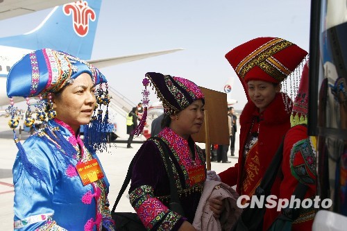 3月2日,参加全国“两会”的代表、委员陆续抵达北京。图为广西代表团的少数民族代表盛装抵京。中新社发 杜洋 摄
