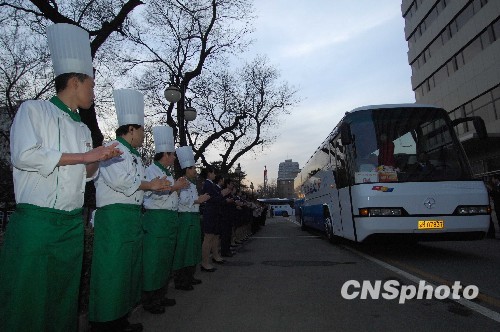 3月2日下午,广东人大代表团抵达驻地首都大酒店,受到酒店全体员工的热烈欢迎,连酒店大厨都站在了迎宾的第一线。中新社发 柯小军 摄