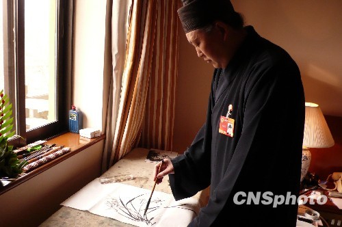 3月3日,全国政协委员、四川青城山天师洞监院唐诚青在友谊宾馆驻地挥毫作画,等待全国政协十一届三次会议开幕。中新社发 符永康 摄