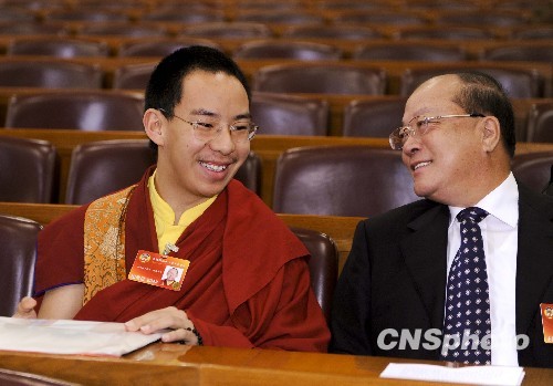 3月3日下午,全国政协十一届三次会议在北京人民大会堂开幕,新增选的全国政协委员十一世班禅额尔德尼·确吉杰布、李长江出席会议。中新社发 廖攀 摄