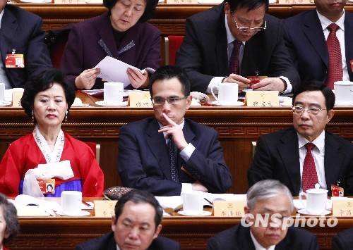 3月3日,全国政协十一届三次会议在北京人民大会堂开幕。全国政协常委李泽钜(中)在开幕会上。中新社发 杜洋 摄