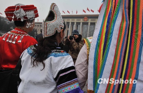 3月5日,出席十一届全国人大三次会议的云南省少数民族代表,鲜艳独特的服饰吸引了在北京人民大会堂前拍摄的记者。中新社发 贾国荣 摄