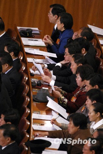 3月5日,第十一届全国人民代表大会第三次会议在北京召开。参会代表听取温家宝作政府工作报告。中新社发 杜洋 摄