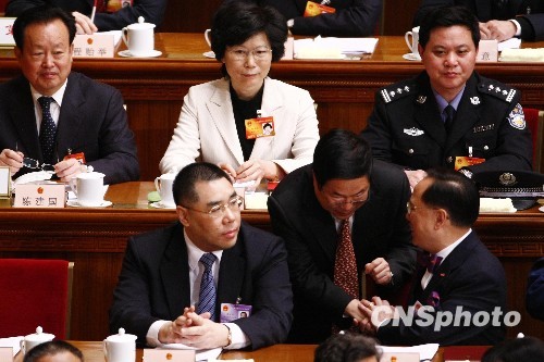 3月5日,第十一届全国人民代表大会第三次会议在北京召开。香港特首曾荫权会前与代表交流。中新社发 杜洋 摄