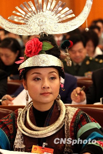 3月5日上午,十一届全国人大三次会议在北京人民大会堂开幕,身着苗族盛装与会的贵州苗族女代表雷阿幼朵成为全场的一个亮点。中新社发 任晨鸣 摄