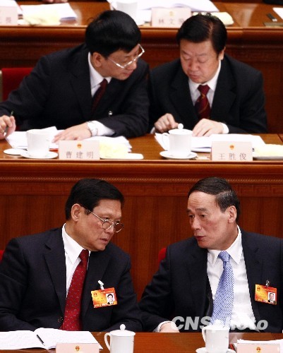 3月5日上午,十一届全国人大三次会议在北京人民大会堂开幕。中共中央政治局委员、国务院副总理王岐山和中共中央政治局委员、北京市委书记刘淇在开幕会前交流。中新社发 杜洋 摄