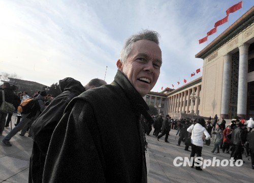 3月5日清晨,美国驻华大使洪博培走向北京人民大会堂,去旁听国务院总理温家宝所作的政府工作报告。中美关系发展在政府工作报告的外交政策部分中备受关注。中新社发 贾国荣 摄
