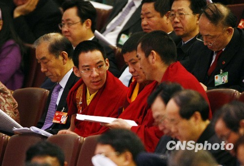 3月5日上午,十一届全国人大三次会议在北京人民大会堂开幕。新增补的全国政协委员十一世班禅额尔德尼·确吉杰布列席会议。中新社发 杜洋 摄