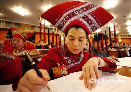 3月5日上午,十一届全国人大三次会议在北京人民大会堂开幕,广西的壮族女代表、忻城县土肥站副站长蒙铁英认真听取温家宝总理所作的《政府工作报告》。中新社发 任晨鸣 摄
