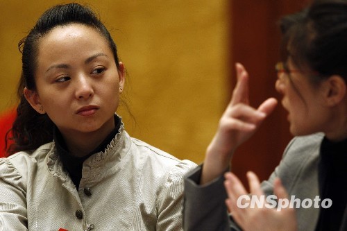 3月5日,在北京出席全国政协十一届三次会议的文艺界委员分组讨论政府工作报告,残疾人舞蹈家、“千手观音”的主演邰丽华委员,通过手语“听”会。中新社发 张宇 摄