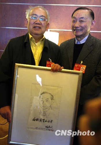 3月5日,在北京出席全国政协十一届三次会议的文艺界委员、中国国家画院艺委会副主任李延声(左),向政协委员、京剧表演艺术家梅葆玖赠送画作。中新社发 张宇 摄