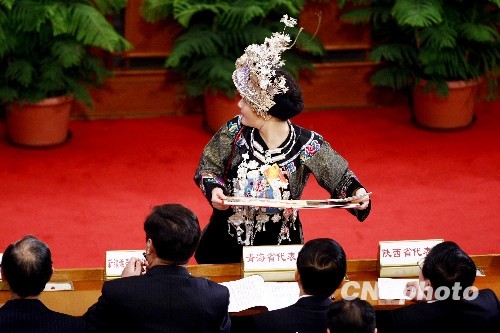 3月8日,十一届全国人大三次会议在人民大会堂举行第二次全体会议。来自重庆的全国人大代表李小燕拿着大会首日封向其他代表索要签名,听到会议开始的铃声,她马上起身回到自己的座位。中新社发 杜洋 摄