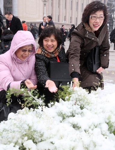 3月8日,北京全城银装素裹,来自澳门的全国人大代表被这美丽的北国风光深深吸引,纷纷嬉雪留影。中新社发 汤彦俊 摄