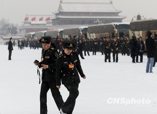 3月8日妇女节,初春的北京下起中雪,全国人大举行全体会议,解放军女代表踏雪赴会。中新社发 廖攀 摄