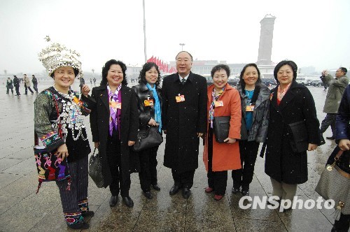 3月8日上午,一群来自重庆的女人大代表邀请重庆市市长黄奇帆在天安门广场合影留念,以此来欢度第一百个妇女节。中新社发 柯小军 摄