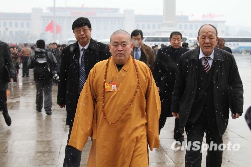 3月8日,全国人大代表释永信冒雪参加第十一届全国人大三次会议第二次全体会议。中新社发 韩苏原 摄