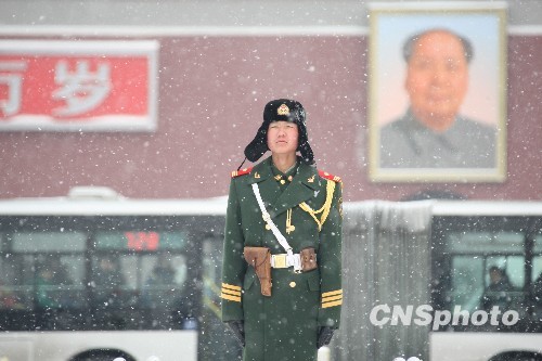 3月8日,北京飘着中雪,武警在天安门前站岗。中新社发 皖风皖韵 摄