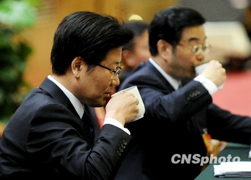 3月12日,湖南代表团召开全体会议审议“两高”报告,湖南省委书记张春贤、省长周强同时举杯,动作协调。中新社发 廖攀 摄