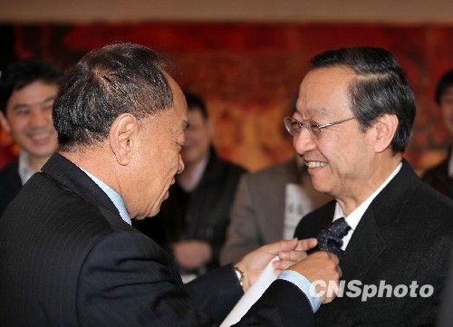 3月12日下午,十一届全国人大三次会议新闻中心在梅地亚中心多功能厅举行主题为“工业结构升级和中小企业发展”的集体采访,工业和信息化部部长李毅中出席并回答记者问题。采访前工信部长李毅中谈笑风生,大会发言人李肇星帮忙整理仪容。中新社发 王保胜 摄