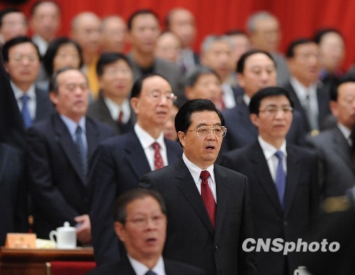 3月13日,全国政协十一届三次会议在北京人民大会堂举行闭幕会,中共中央总书记、国家主席胡锦涛出席大会。图为大会结束时胡锦涛和全体与会者高唱国歌。中新社发 廖攀 摄