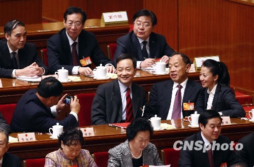 3月14日上午,十一届全国人大三次会议闭幕会在北京人民大会堂举行,“玉米大王”李登海为李肇星等代表拍照留念。中新社发 杜洋 摄