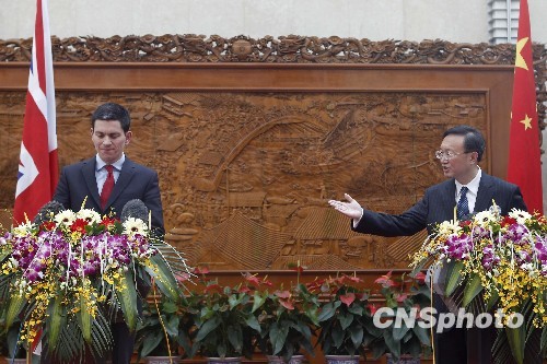 3月16日,中国外交部长杨洁篪在北京与英国外交大臣米利班德举行会谈。会谈后,杨洁篪与米利班德共同会见记者。中新社发 盛佳鹏 摄