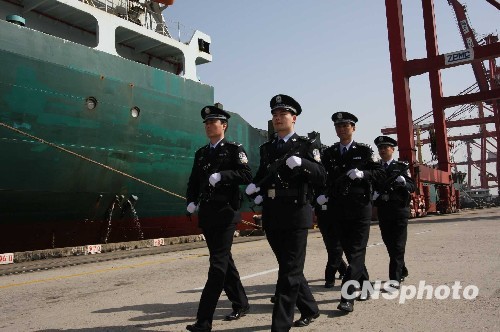 吴淞边检站3月17日举行世博安保工作誓师大会,并同时举行了赠枪仪式。世博会开幕在即,沪边检部门不久将“持枪上岗”保世博平安。有关人士表示,针对世博安保工作和口岸安全需要,世博会期间,边检警员将配枪执勤,此举措是上海边检机关自1998年转制以来首次对所有海港边检站执行船舶监护任务的民警进行配枪执勤。中新社发 陈静 摄