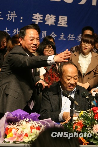 3月17日下午,刚刚参加两会后的“明星外长”李肇星做客江西九江学院濂溪讲坛,受到青年学生的热烈追捧,纷纷请李肇星签名、合影留念,为维持秩序,校长甘筱青不得不上前“护驾”。中新社发 张海岩 摄