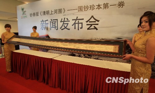 3月18日,钞券珍本《清明上河图》在上海与媒体见面,它将成为2010年上海世博会中国馆的镇馆之宝。该钞券珍本是中国印钞造币总公司13位雕刻工艺大师经历5年精心创作的,画中的人物、牲畜、船只、楼宇、车辆等形态、动作、气息、神韵等都逼真、精巧,堪称国钞珍本第一券。中新社发 潘索菲 摄