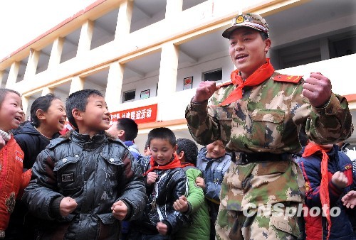 3月18日,武警安徽滁州市中队9名官兵来到琅琊区城南小学,开展国防教育,展示军警风采,共创“双拥”文明活动。连日来,该中队积极织织部分官兵,深入驻地所属的扬子路小学和城南小学等“共建”学校,向广大少年儿童讲解国防知识,帮助孩子们进行军事化训练等,以增强小学生们的国防意识和爱国主义热情。中新社发 王家国 摄