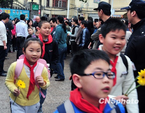 3月24日,福建南平实验小学恢复上课。路上,有的学生手拿着黄色菊花,他们说,“我们想念不在的同学,希望大家坚强。”该校教师全员到岗,相关公安部门也在门口值勤,在学校门前做好学生护送工作。中新社发 张丽君 摄