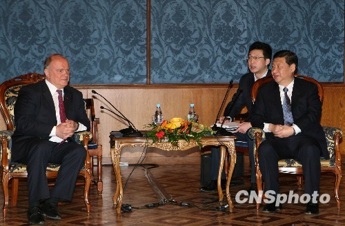 3月24日,正在俄罗斯访问的中共中央政治局常委、中国国家副主席习近平在莫斯科会见俄罗斯联邦共产党主席久加诺夫,双方就党际交流与合作等问题进行了会谈。中新社发 田冰 摄