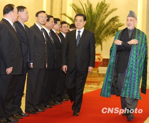 3月24日下午,中国国家主席胡锦涛在北京人民大会堂欢迎阿富汗伊斯兰共和国总统卡尔扎伊访华。中新社发 任晨鸣 摄