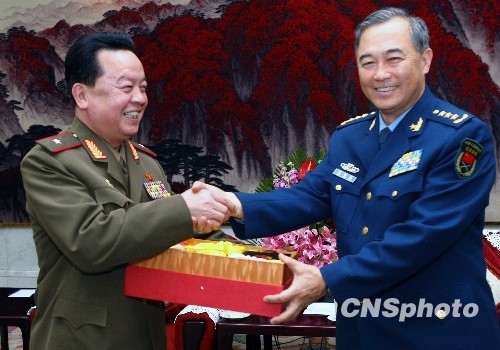 3月30日,中国人民解放军副总参谋长马晓天上将在北京八一大楼向朝鲜人民武力部外事局长安永基,赠送一套中华红茶具,以表达他对“老朋友”的友谊。中新社发 宋吉河 摄