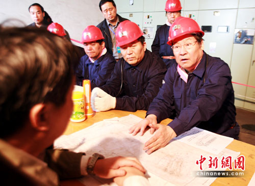 4月3日上午,国家安全监管总局副局长、国家煤矿安监局局长赵铁锤率工作组在河南省洛阳市伊川县国民煤业有限公司煤与瓦斯突出事故抢险救援现场,研究救援方案,赵铁锤在现场强调,当前的第一任务目标是全力以赴、千方百计解救被困矿工;基本原则是科学施救、多措并举、突出重点、分区实施。中新社发 王中举 摄