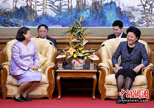 4月4日,中国国务委员刘延东在北京钓鱼台国宾馆会见了泰国公主诗琳通。中新社发 廖攀 摄