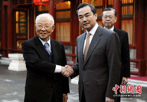 4月6日晚,中台办、国台办主任王毅在钓鱼台国宾馆会见了由许历农率领的台湾新同盟会退役将领访问团。王毅高度赞扬许历农等长期以来致力推动两岸关系的努力,并期许发挥更大作用。许历农表示此行旨在加深两岸退役军人的情感与交流,促进两岸关系和平发展。图为王毅迎接许历农。中新社发 刘震 摄