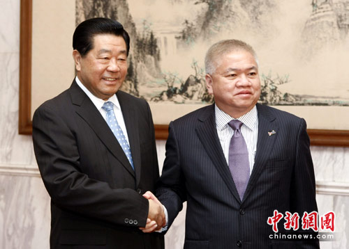 2010年4月7日,中国全国政协主席贾庆林在北京钓鱼台国宾馆会见了马来西亚上议院议长王茀明。中新社发 盛佳鹏 摄